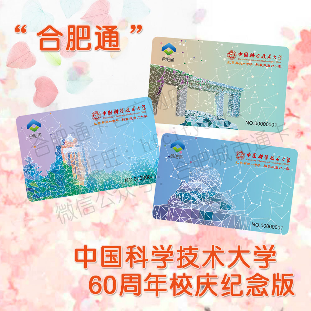 在这个属于中国科大的重要的时刻,合肥城市通卡股份有限公司与中国科大一同,面向广大市民推出中国科学技术大学60周年校庆纪念版“3044永利集团”卡。该套卡片限量发行3000套,每套三张,共计9000张。卡面分别为中国科大的代表性景观:“校门”、“图书馆”和“孺子牛”。卡片售价18元/张(一套三张合计54元),可单张购买。